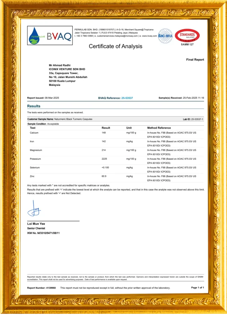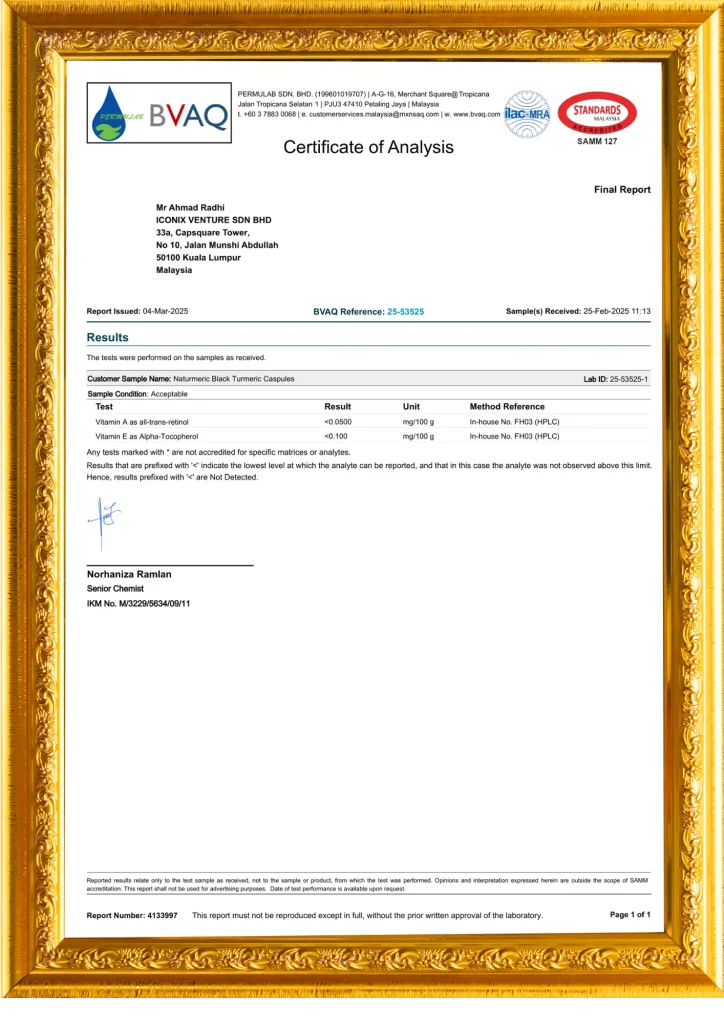 Produk Naturmeric yang sedang kami bangunkan ini telah disahkan 100 peratus mengandungi kunyit hitam tulen oleh Universiti Putra Malaysia.